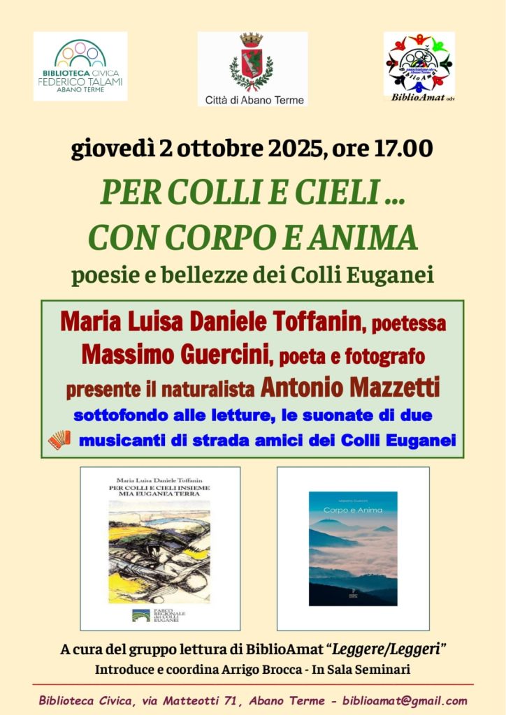 Un pomeriggio variegato di poesia, musica, foto sui Colli Euganei, quello organizzato dal gruppo lettura di BiblioAmat “Leggere/Leggeri” con magiche conclusioni sul Silenzio dei colli ad opera di Antonio Mazzetti naturalista. Apre l’incontro Arrigo Brocca presentando Maria Luisa Daniele Toffanin, autrice di Per Colli e Cieli insieme mia euganea terra (II^ edizione -Valentina Editrice, 2024).